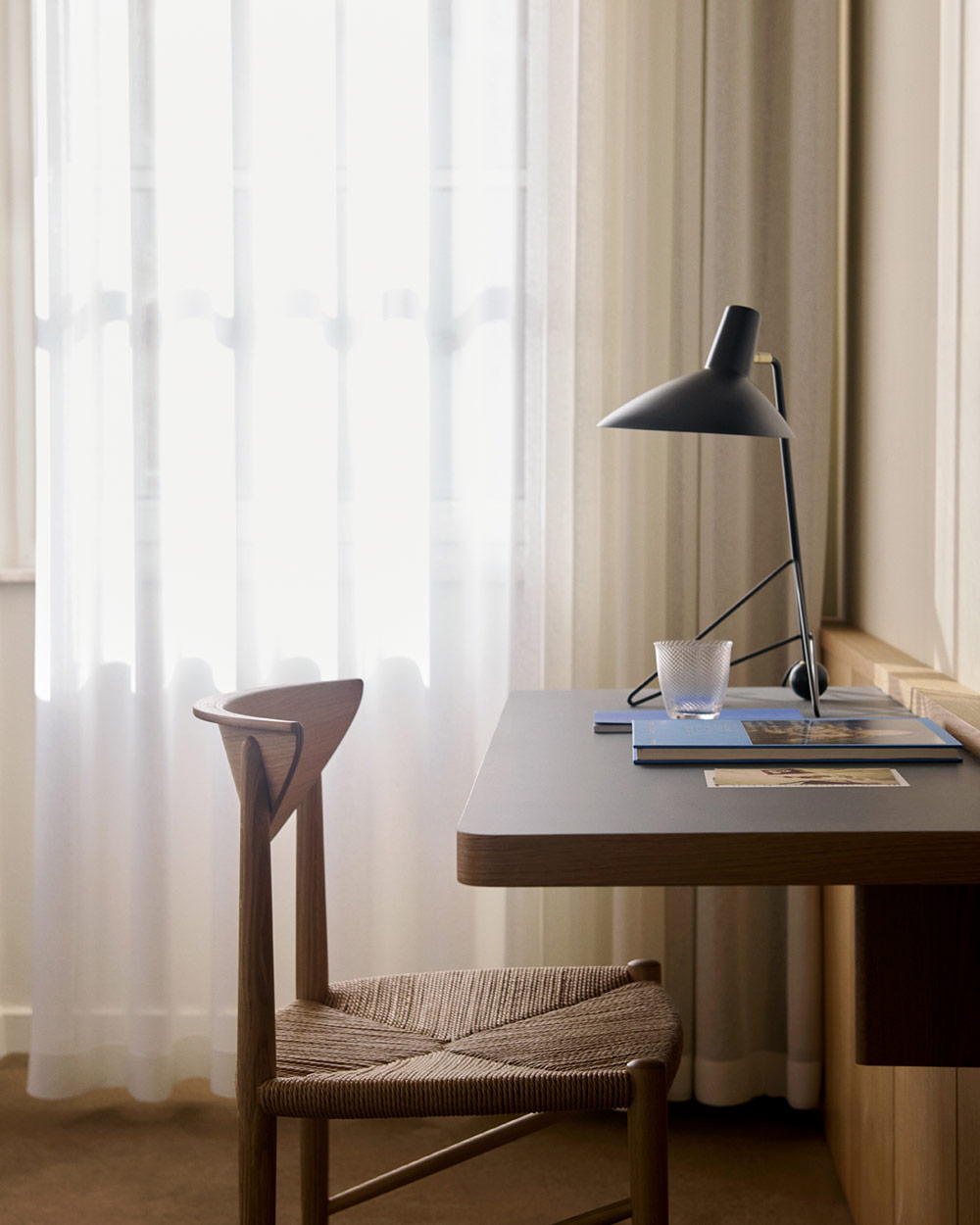 Omhyggeligt restaureret for at bevare de originale detaljer forener hvert af de 40 værelser hos Petra det subtile i Kay Fiskers arkitektur med moderne og klassiske designs fra &Traditions kollektion. For at sikre, at intet værelse er helt som de andre, fremhæver speciallavede inventarløsninger i massivt træ rummenes individuelle karakter og skaber en unik oplevelse for hvert ophold.